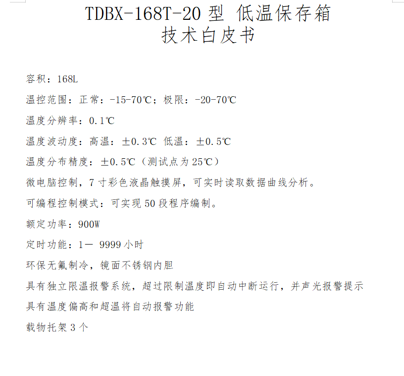 TDBX-168T-20型 低溫保存箱 技術(shù)白皮書 容積:168L 溫控范圍:正常:-15-70℃;極限:-20-70℃ 溫度分辨率:0.1℃ 溫度波動度:高溫:±0.3℃ 低溫:±0.5℃ 溫度分布精度:±0.5℃(測試點為25℃) 微電腦控制,7寸彩色液晶觸摸屏,可實時讀取數(shù)據(jù)曲線分析。 可編程控制模式:可實現(xiàn)50段程序編制。 額定功率:900W 定時功能:1- 9999小時 環(huán)保無氟制冷,鏡面不銹鋼內(nèi)膽 具有獨立限溫報警系統(tǒng),超過限制溫度即自動中斷運行,并聲光報警提示 具有溫度偏高和超溫將自動報警功能 載物托架3個 優(yōu)點 安全性