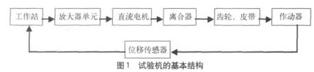 拉力試驗機橫梁的基本原理(見圖1)是:由工作站發出給定信號,給定信號通過放大器單元來驅動直流電機,直流電機轉動帶動齒輪和皮帶運行,并使作動器開始移動。位移傳感器把測到的作動器位移信號反饋給工作站,再與工作站中的給定信號比較,形成閉環控制系統,這樣可按試驗要求實現作動器的移動。