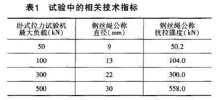 例如:校準(zhǔn)100kN臥式試驗(yàn) 機(jī),選用6×9W+FC纖維芯鋼絲繩,d:13mm,鋼絲繩公稱抗拉強(qiáng)度為1870MPa,K":0•332,最小破斷拉力為 104•0kN。各種規(guī)格臥式拉力試驗(yàn)機(jī)選用不同直徑的 6×9W+FC纖維芯鋼絲繩的公稱抗拉強(qiáng)度,如表1所示。